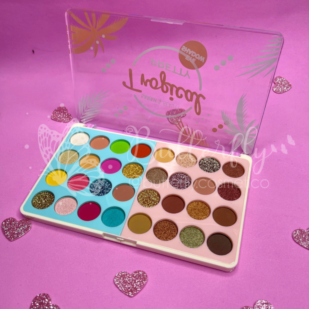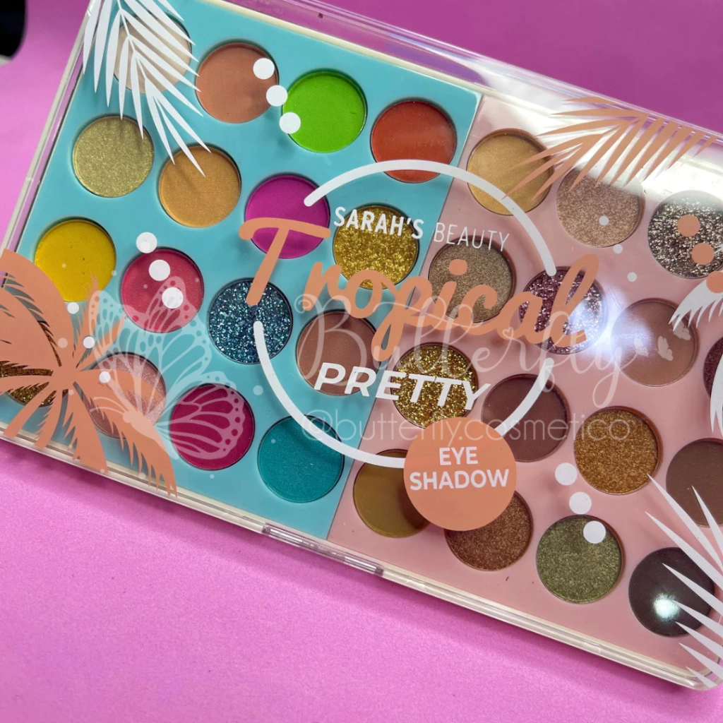 - A Paleta de Sombras Tropical pretty Sarah´s Beauty possui 32 lindas cores, variando entre cintilantes, matte e glitters prensados.